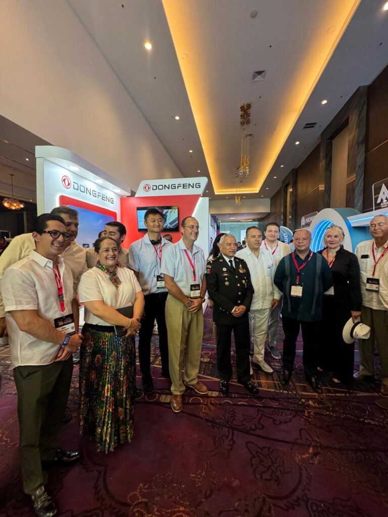Miguel Martínez (Presidente de CANACAR), Gabriel De Uriarte Occelli (CEO & Director General Dongfeng Camiones), y ZhangJinyuan (Director de Marketing de América, DFMIEC), entre otras altas personalidades de la cámara y socios transportistas en el stand de Dongfeng Camiones.