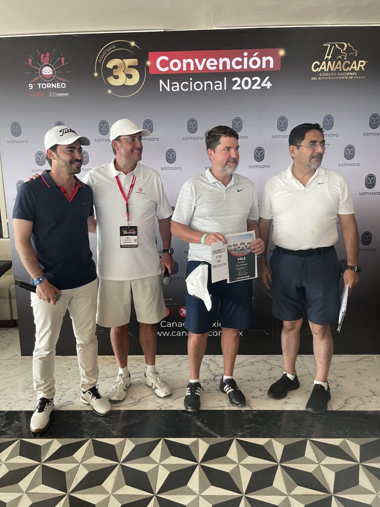 Ganador del tiro más largo; premio en el torneo jugado en el hoyo de Golf patrocinado por Dongfeng Camiones). En la foto: Miembros de CANACAR, Gabriel De Uriarte Occelli (CEO & Director General Dongfeng Camiones) y El socio ganador: Gustavo A. Belchez, de Phi-Cargo.